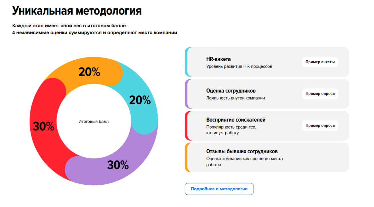 При формировании рейтинга учитываются данные из HR-анкеты, мнения действующих сотрудников и людей, сотрудничавших с компанией раньше.