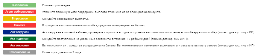 - Агент заблокирован — отмена выплаты из-за блокировки аккаунта, обратитесь в техподдержку.