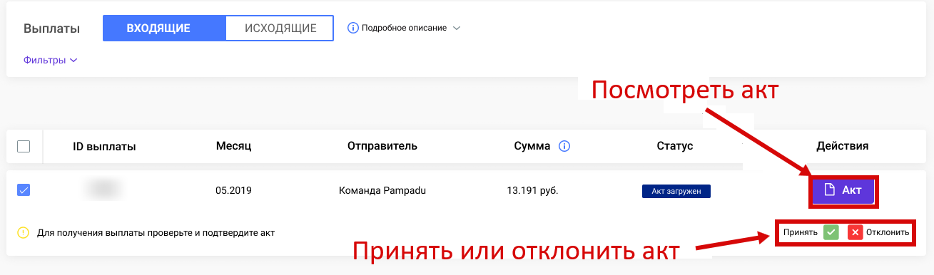 - Принять акт. В начале месяца Pampadu формирует акт за предыдущий период. Для его принятия нужно просто кликнуть на соответствующую кнопку.