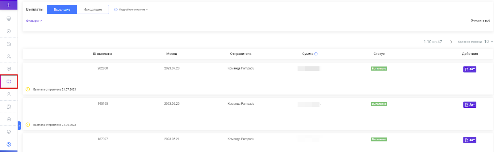 Вся информация о балансе, начислениях, статусе транзакций доступна в личном кабинете Pampadu. Перейдя в раздел «Выплаты», вы сможете: