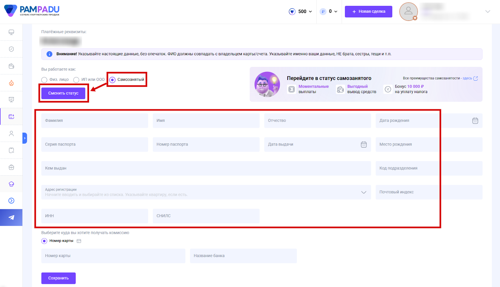 - Укажите, что вы самозанятый, заполните ИНН, номер карты, паспортные данные, контактную информацию.